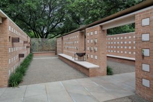 No matter the speed at which you pass a former Sanger-Harris department store, the entry is sure to catch your eye. The Valley View Center location in north Dallas, designed by Harold A. Berry & Associates and built in 1973, is home to the largest remaining Sanger-Harris mosaic. (The one on the downtown store was removed after Sanger-Harris, later Foley’s, vacated the space in 1990, and the building was converted into Dallas Area Rapid Transit’s headquarters.) The pattern of this mosaic is more geometric in form and seems to emphasize the centrally located entries on each facade. Still abstract, the primary colors form a textile-like pattern that more closely resembles a Rorschach test than the sweeping form that adorned the downtown flagship store. The signature of Brenda J. Stubel can be found along the bottom edge of the facade, though limited information could be found on the details of her involvement.