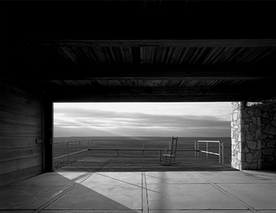A wood entry deck lifts the primary floor above grade (“to keep the snakes out”), and when one passes through the 20-foot-square room it projects as a cantilevered platform into the northwestern sky. Two sliding wooden shutters on north and south open and close this room as though it were a box camera set on the shelf. The view is captured in the mind’s eye, as is so perfectly done in Hester + Hardaway’s stunning image. The “proportion of concerns” it reflects is that of a view with a room.