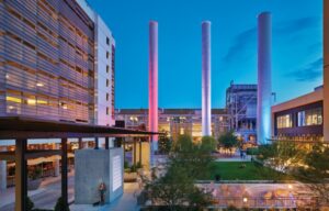 A hybrid system of tilt-up concrete and steel with brick and glass infill proved to be both cost-effective and conducive to the large high bay structures speculated to be required. Over the design and occupation of the project, different programs began to occupy the bays marked by the top-heavy concrete panels and a truss system of roof windows letting natural light pour in while setting up a rhythm for the overall structure. None of the interior walls are load-bearing. “We joined small tilt wall panels with long-span trusses,” says design director William Truitt, AIA. “That way the exterior would alternate between concrete and masonry that faces the campus, and the high bay labs could be configured in any way now or in the future as the program changes. And it will change.” As late as move-in day, the architects were responding to new equipment acquisitions and private partnerships that continue to contribute through sponsorship of classes and programs.
