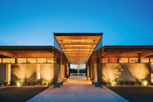 The addition uses the Stretto House as a foyer: You can only enter by passing through the main public spaces of the existing house and an art gallery that is now a transitional passage. Once in the glazed connecting gallery, you experience the site entry sequence in reverse, looking back toward the motor court and the main gate. A bench seat and a bespoke art piece make moving through this passage eventful and memorable. One animating vignette is a slice of the arching carport roof, visible through the glass as a reminder of how the original house differs from the addition.