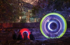 The design of this project for the MoMA PS1 Young Architects Program was bookended by the election and inauguration of Donald Trump, whose call for a wall on the U.S.-Mexico border has become a device of hate. While Trump’s wall is an embodiment of intolerance and xenophobia, “Blow Up The Wall!” aims to turn a wall into a place of inclusion. Large inflated figures hang over the MoMA PS1 courtyard walls, making places to gather, tarry, and find refuge. During the museum’s Warm Up dance parties, lights lining the inflatables’ surfaces pulse to the music, and rocking benches pump up the bulging figures. Over time, a streaking mixture of pink, white, and yellow sand roils at the installation’s base.