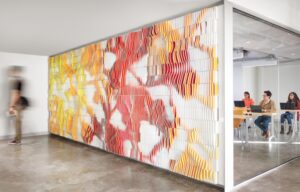 The interior patio is framed by the carport, the long west-side bar, and a perpendicular wing that projects to the east. In the patio, Koush’s 3-foot, 6-inch planning module is evident in the dimensions of the house’s floor-to-ceiling windows. Separating the back of the studio from the entrance to the house is a spacious, outdoor room, which Koush calls the “dogtrot.” At 21 by 19 feet in dimension, it is virtually an outdoor living room. After the house was completed, Koush inserted a wood lattice between structural piers on the west side of the porch to moderate penetration by the afternoon sun and screen views of the neighboring yard. Koush observes that the lattice still permits daylight to illuminate the space and doesn’t block the breeze. White-painted vertical wall siding and ceiling decking and a gray-stained pine plank floor give the dogtrot a tranquil feel. Koush used one-inch-square steel bar for the hand and stair rails on the side of the dogtrot. The cross walls within the dogtrot are aligned at an angle in order to preserve a native pecan tree on the property, making the space a parallelogram in plan rather than a rectangle. This divergence from the orthogonal creates a subliminal sense of volumetric expansion.