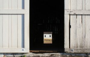 The house is simply organized. A living-dining-kitchen area is spatially continuous with the dogtrot. Koush spanned the space with a steel beam and kingpost tying into the house’s steel ridge beam to rigidify the open-gable roof structure. He installed projecting lighting fixtures to illuminate wall-mounted art, and he detailed the kitchen millwork to reinforce the space’s scale and proportions. The side wing and the rear of the west wing each contain a bedroom and an attached, skylit bathroom. (While Koush maintained a muted palette throughout most of the interior, he reserved architectural color for the bathroom tile.) The bedroom in the side wing is used as a painting studio by de las Cuevas. Between the kitchen and the back bedroom is a wide, deep closet where art and objects can be stored when not on display; Koush calls this space the “gift shop.”