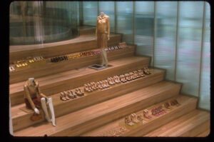 The gallery was built as a big house, using local tradespeople accustomed to working in Houston’s typical sticks-and-stucco construction. The white volume is carved to reduce its mass. Curved, steel-framed windows slice through the facade, softening its appearance and creating a sense of movement that contrasts with its weight. In order to achieve this effect, the columns were shaved down to accommodate the custom window frames, which were projected onto the walls for the fabricators to draw. The result is successful, though it does not read as unstable, which was the intent. The details are not perfect, inside or out. The construction “evolved on-site with the contractors and fabricators” and was, for all, a “labor of love over 18 months,” according to Schaum.
