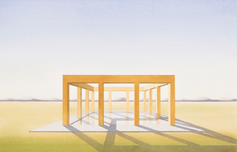 This act of centering in architecture is perfectly expressed in the Pantheon’s ocular aperture, which exists at the exact axial apex of an implied spherical architectural volume. Its numinous equivalent in another way would be illustrated by Ise Shrine’s “august column of the heart” (shin-no-mihashira) or “heart post.” Representing the sakaki bush sacred to Shinto, the post — the “true pillar” — is hidden from view at all times. In the 20-year interim between each rebuilding of the shrine, the post is covered by a small, gabled wooden structure (oi-yu) in a field of white gravel (kodenchi); the arrangement itself being an exquisite “object in a field.”