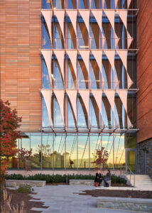 The lobby entrance is intentionally ambiguous, meant to foster a sense of discovery while providing a secure entry familiar only to students and faculty. The space features high-performance glazing in the form of two walls of adaptive electrochromic glass to control light and heat. Each window automatically adjusts based on exterior heating and light conditions, becoming more tinted on a bright day and more translucent when the sky is overcast. The windows are also programmable, allowing building operators to override the self-adjusting systems as desired.
