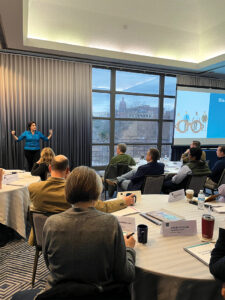 At the top of the lobby’s curving stair, an interior window looks onto a classroom that contains several computers along the back wall and a wide empty space in front of them. This turned out to be a room for augmented and virtual reality (AR/VR), designed with enough space to prevent students and faculty from hitting walls or other objects in the room while they wear AR/VR headsets. The vast space can also be used for robotics learning in the future. The next room we visited was a 360-degree classroom (designed for an instructor to present from the room’s center rather than at one end) with three tables — each equipped with TV screens — located along the perimeter. Professors and students can connect to each TV so that their presentations are easily viewable by everyone versus on only one screen, as in a traditional classroom layout.