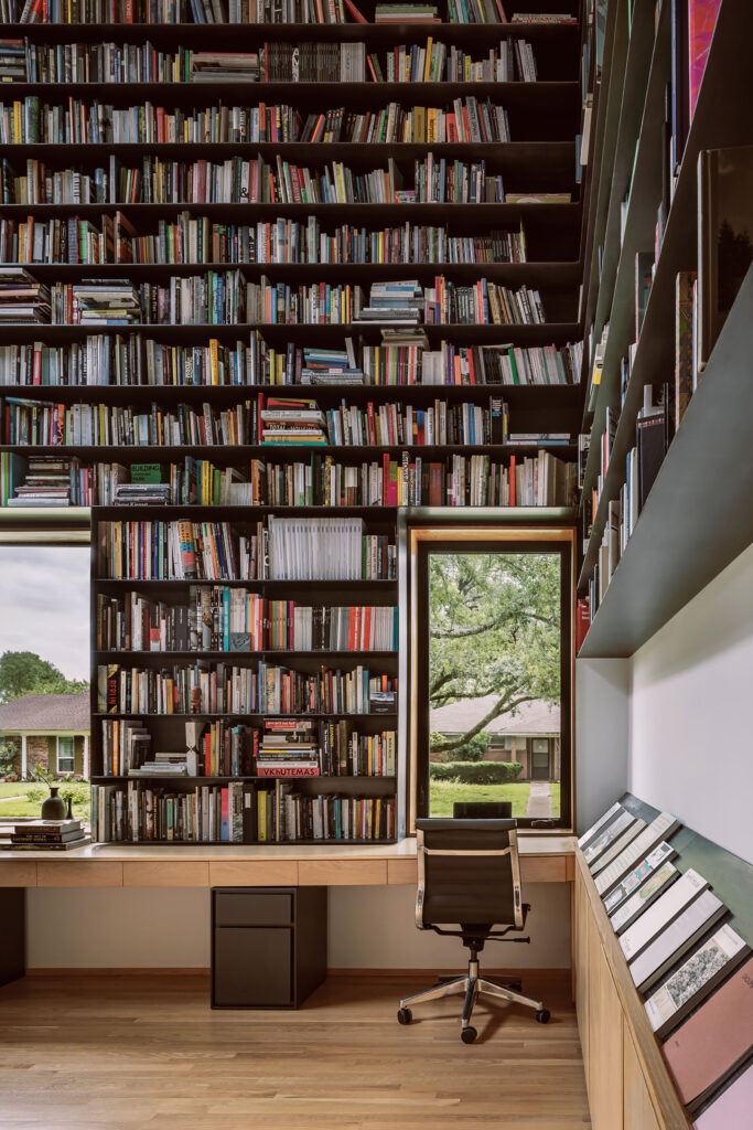 This home orchestrates raw, elemental materials to define thresholds and evoke comfort. Dark brick wraps the exterior, blurring the shift between the upper and lower volumes, while recessed spaces provide shaded points of entry. A tall volume at the southeast corner frames the front door, which is accessed through a wood-lined space that opens to the sky and up a pathway of rugged stones surrounded by wildflowers. Inside, an elevated platform with exposed wood beams mediates between the living spaces and library, which features a wooden desktop and plate steel shelves filling the space above. Polished concrete floors cool bare feet in the summer, and generous windows and sliding doors connect the interior to a covered patio. A sculptural staircase of rough-cut wood and steel defines the threshold between public and private realms.