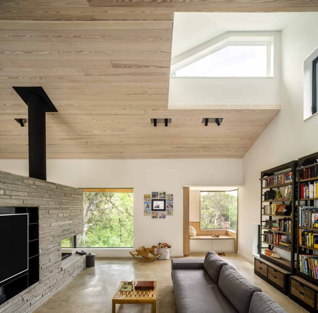 “Lake Belton House combines a typical typology of the gabled roof with interesting punctures of new geometries that allow for playful interior locations, and when those are coupled with the many apertures that allow in light through the exterior, the building begins to blend with the landscape.”