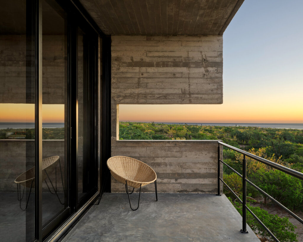 Nestled among boulders, cacti, and elephant trees, this off-the-grid surf retreat responds to a site that is both arid and coastal—hot and dry most of the year, yet subject to corrosive salt air and occasional hurricanes. Constructed of cast-in-place concrete, board-formed on the exterior and smooth within, the house reflects the rugged landscape while ensuring durability. Its southeast orientation allows capture of coastal breezes for passive cooling, and palo de arco screens—woven by local craftsmen—are used on terraces and facades to reduce heat gain and create comfortable microclimates. The ground-level houses services, storage, and lounges that open to the desert floor, while upper living and sleeping spaces are divided into three volumes connected by open-air bridges. Shaded rooftop terraces frame shifting plays of light, expansive horizons, and seasonal whale migrations.