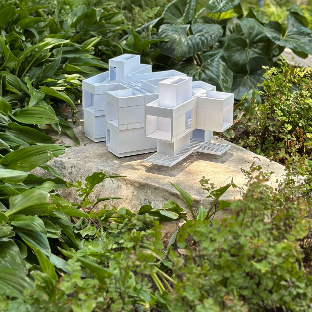 Aggregate House draws on the principles of Fumihiko Maki’s Group Form to employ multiple lot ownerships, creating human-scale moments within a collective form on a single-family lot. Sited on Houston’s standard 60-by-120-foot lot, which allows up to two structures with shared primary spaces, this two-story proposal features an active ground-level zigzag porch linking all common areas vital to the upper level and incorporates a useable rooftop garden. The design derives from the semiotics of H&V font characters, shaping an aggregate of rooms and corridors unifying the second floor. Two stairways and shared spaces structurally support the party-wall massing. Regional precedents, such as dogtrot, or breezeway, houses, inform passive ventilation through an open ground-floor corridor, enhancing airflow and improving thermal comfort.