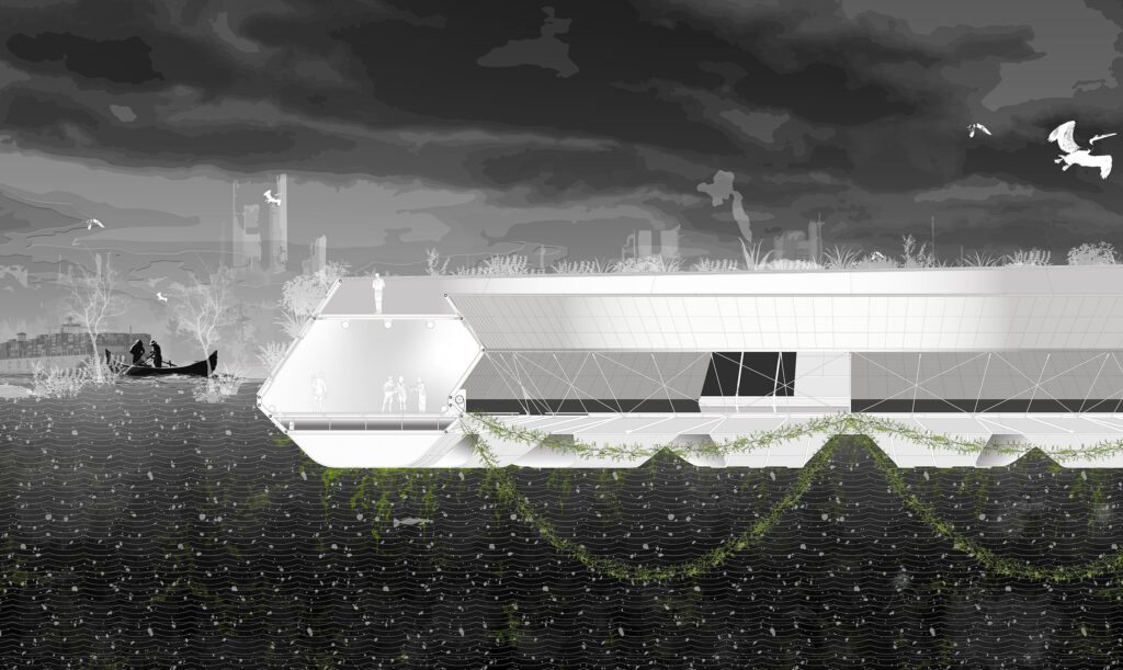 This speculative design proposal envisions a resilient, post-disaster future for the Texas Gulf Coast in 2060. In the aftermath of Hurricane B-60—a fictional Category 5 storm that permanently submerges the Brownwood Peninsula—the project reclaims the drowned landscape as a site for ecological and social renewal. At its center is the Gaia Device, a network of 16 floating modules that act as both refuge and regenerative infrastructure. Eac unit supports flexible living with sleeping pods, communal kitchens, wet labs, and climate-resilient safe zones. The system merges architecture with ecology through the cultivation of Gracilaria seaweed for insulation, filtration, and facade systems. Over time, the Gaia Device transforms from active shelter into a living reef, dissolving gradually into the seascape.