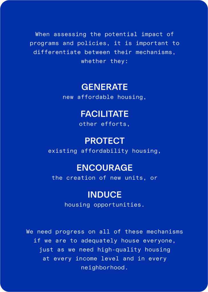 How can a zoning change—with no income restrictions and without subsidized funding—lead to more affordable housing? Efforts that generate actual dwelling units have the greatest immediate impact, while those that encourage and induce the construction of diverse housing are slower but more pervasive. These differences should inform how we prioritize and fund initiatives, but we cannot risk treating housing as a zero-sum game where people oppose shelters because they are not permanent solutions, or reject first-time homebuyer support because it doesn’t address acute chronic housing insecurity.