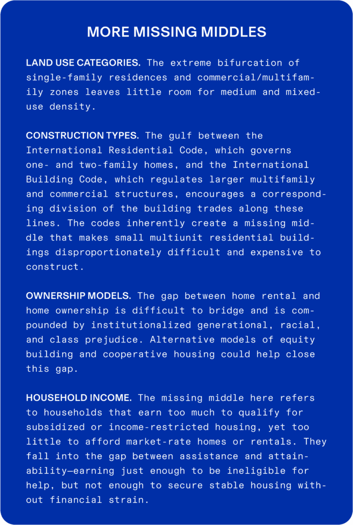 We must not forget however that typology is just one of several spectrums that must considered when addressing the factors influencing housing affordability and stability. Many others—land use categories, construction types, ownership models, and household income, to name a few—also have a middle that is missing.