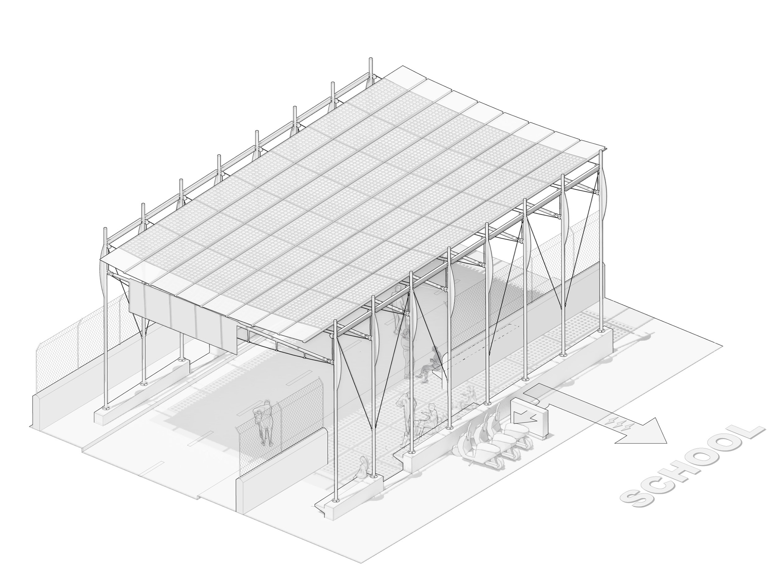 While easily adaptable, the design remains consistent in its iconography. Draped, locally produced fabrics—custom patterns to come—distinguish each neighborhood or school. Lightweight frames use the photovoltaic panels’ weight to tighten a cable system, ensuring lateral stability.