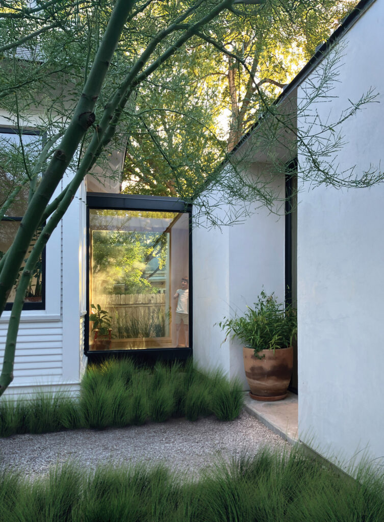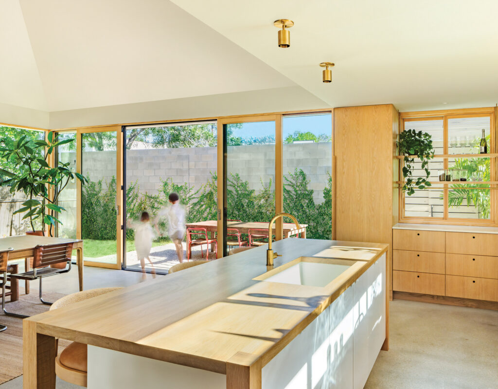The feeling of spaciousness provided by the home was intentional in the design. “The property feels way bigger because you walk all the way back to come inside, and then walk all the way back up front to the private spaces,” explains Pryce. He observes that their three children, ages seven, five, and one, “flow in and out.” The ever-present connection to the outdoors is tangible. Hannah contrasts life in the original bungalow as “a little dark” compared with their experience in the addition, the new space receiving so much light that “we can still feel connected without the kids begging to leave the house.” Estes wittingly posits projects that utilize outdoor space as her example of “living larger.”