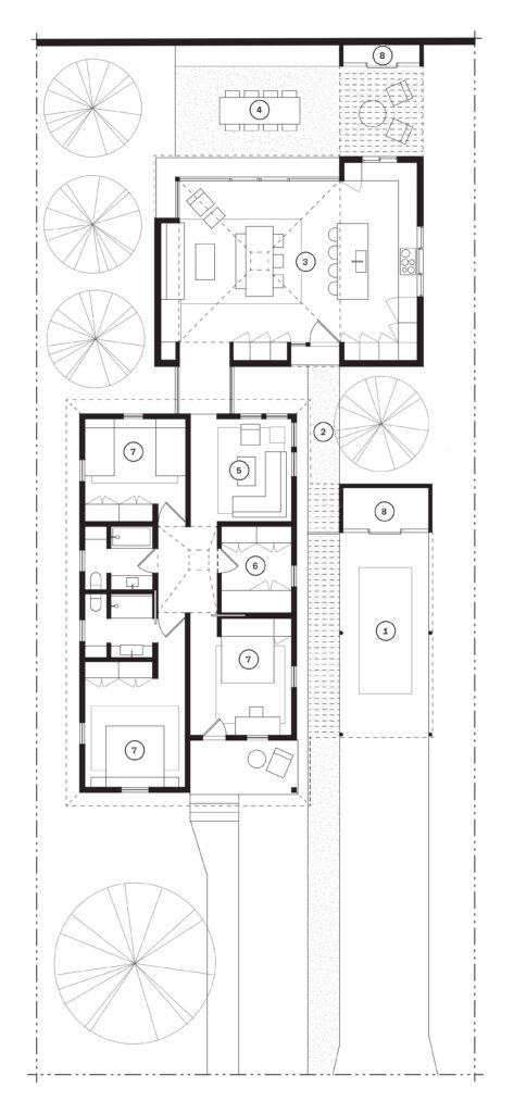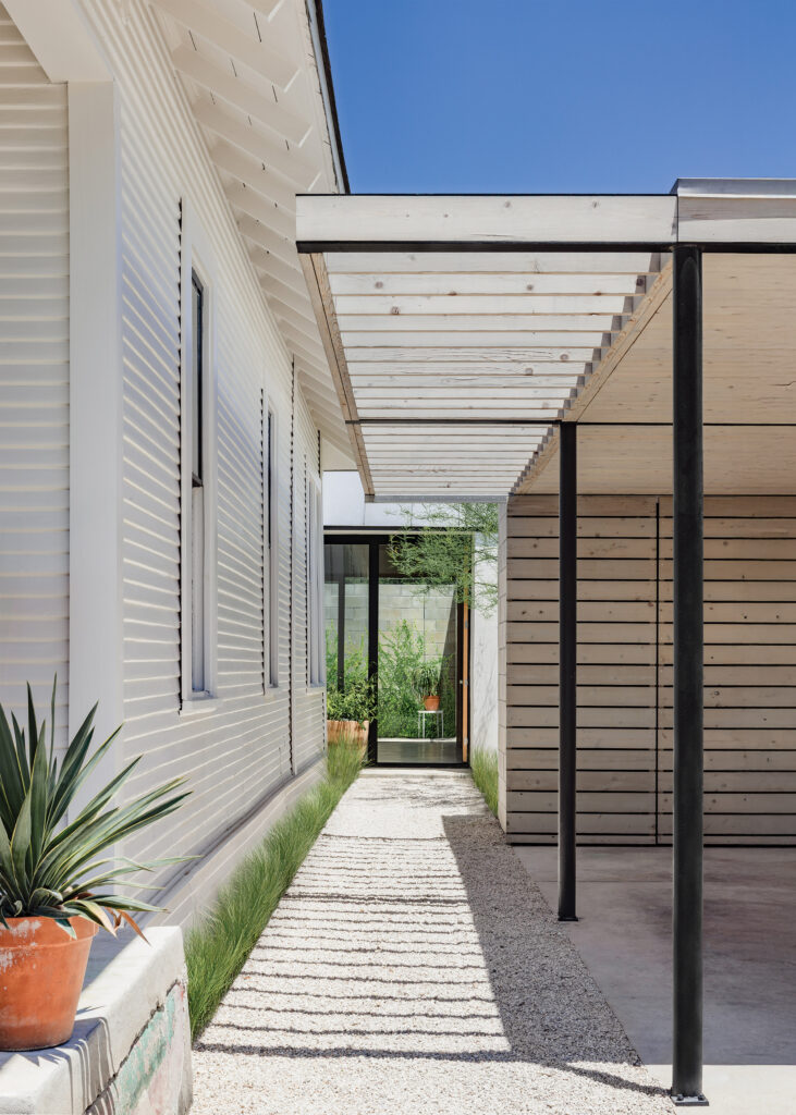 The Cootie Catcher inspires immediate curiosity upon approach. The original front porch now serves as an ensuite, plant-filled patio adjacent to the primary bedroom. The new entry sequence is framed by the historic east facade of the original home and a new carport. An elegant shade structure and limestone path welcome the owners and visitors alike through the lot, where the light-filled spaces unfold.