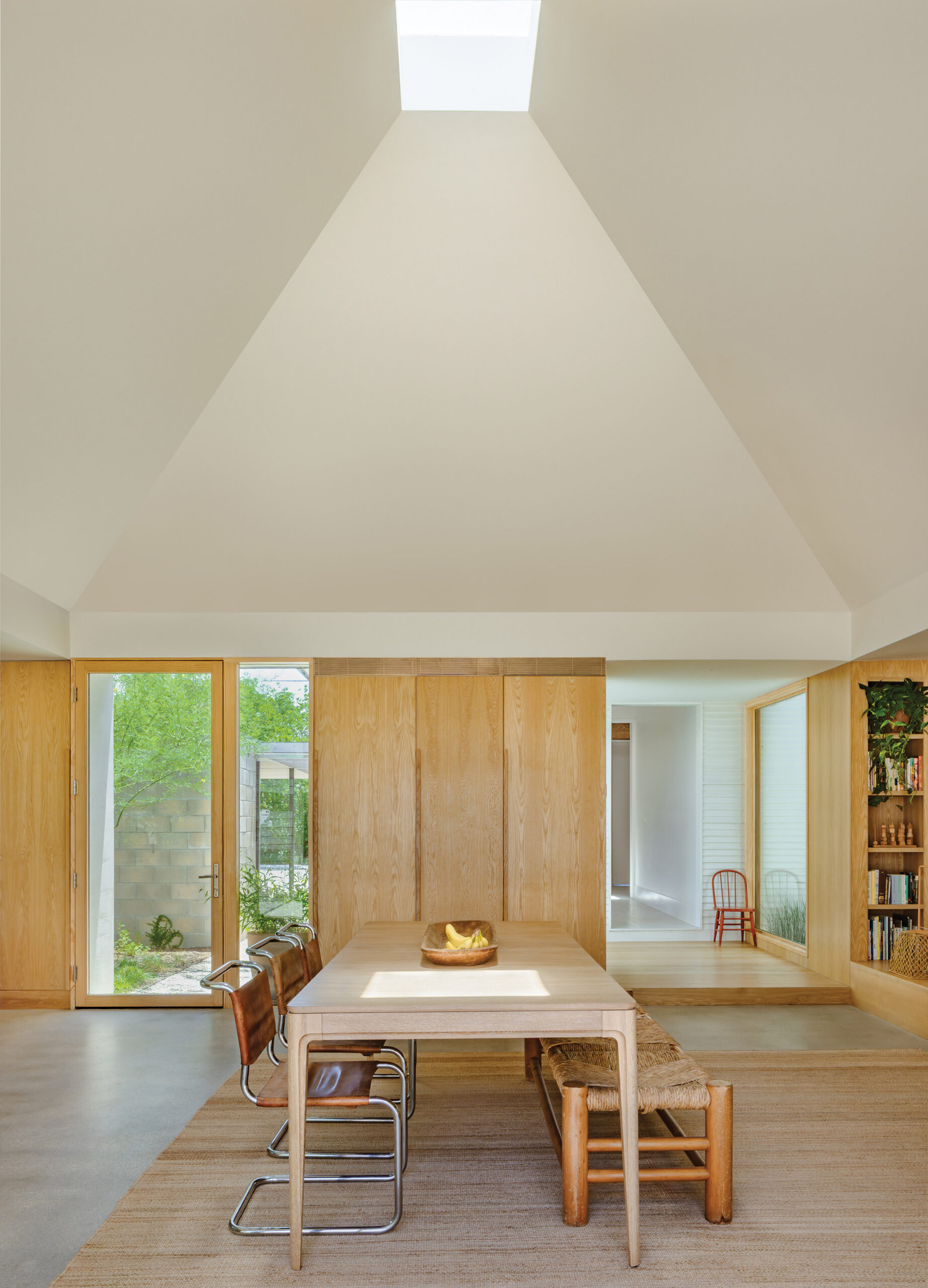 The glazed entry leads with a glimpse of the awe-inspiring skylight in the main living area. Its unexpected pyramid-like oculus blankets the interiors with warmth soaked up by white oak millwork. Stepping inside seems like an embrace. In fact, it was this surreal comfort that led the owners to choose this very spot for a home birth under the picture-framed sky. It is here in the cocoon-like room where daily life occurs. Spaces flow back to the street from the main kitchen, dining, and living area to the more private spaces in the original structure. A transparent bridge acts as threshold, connecting the addition to the older portion of the home, which has been renovated to accommodate three bedrooms, two baths, and a smaller family room. Marking a clear divide between new and old, the bridge also provides a direct connection to the outdoors, a theme carried throughout the home.