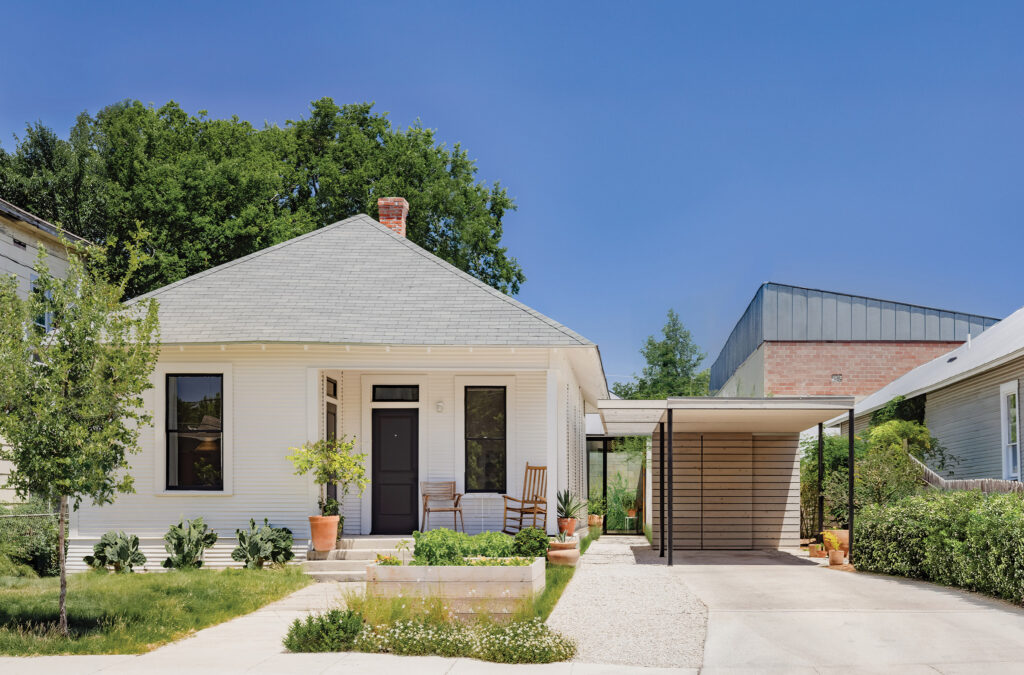 Just one block over from San Antonio’s trendy Pine Street in Dignowity Hill sits a recently renovated 1930s pattern book home fondly called the Cootie Catcher. The name refers to a folded fortune teller, the paper equivalent of a child’s Magic 8 Ball, and is an apt description of the expansion of the historic residence. The 650-sf addition mimics its playful origami namesake, discreetly tucked behind the original home.