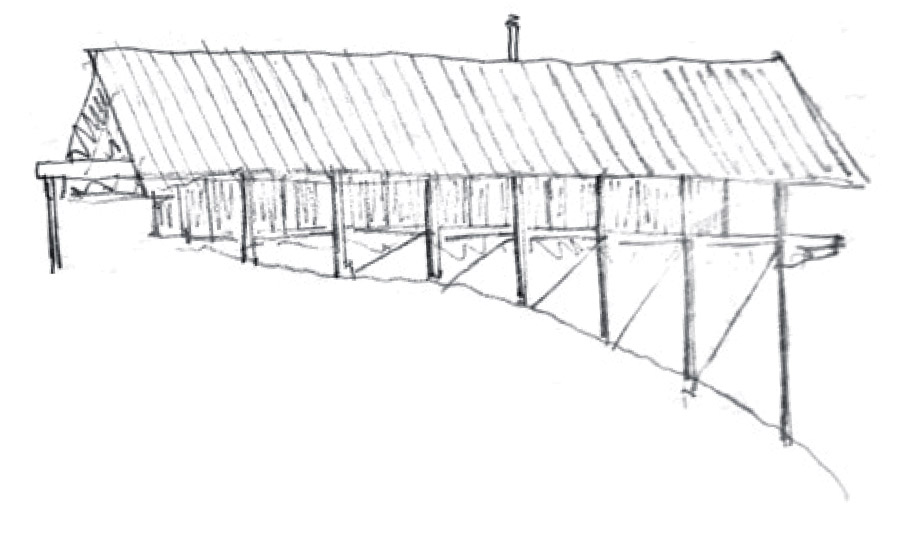 Made of steel and yellow pine, built on a budget, and designed to be self-sufficient in a harsh environment, the home carries a distinct industrial character—industrial in the sense that economy and efficiency informed every aspect of the design. The house is reminiscent of a mining shaft attached to the side of a mountain or hill in Appalachia or the Rockies; it seems to have landed on the site, almost like a ship entering a harbor. The concept sketch of the home encapsulates this idea as well. The premise is simple: a home that minimally impacts the surrounding environment while taking full advantage of it.