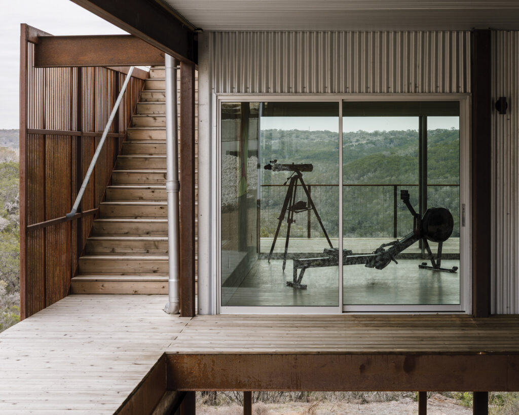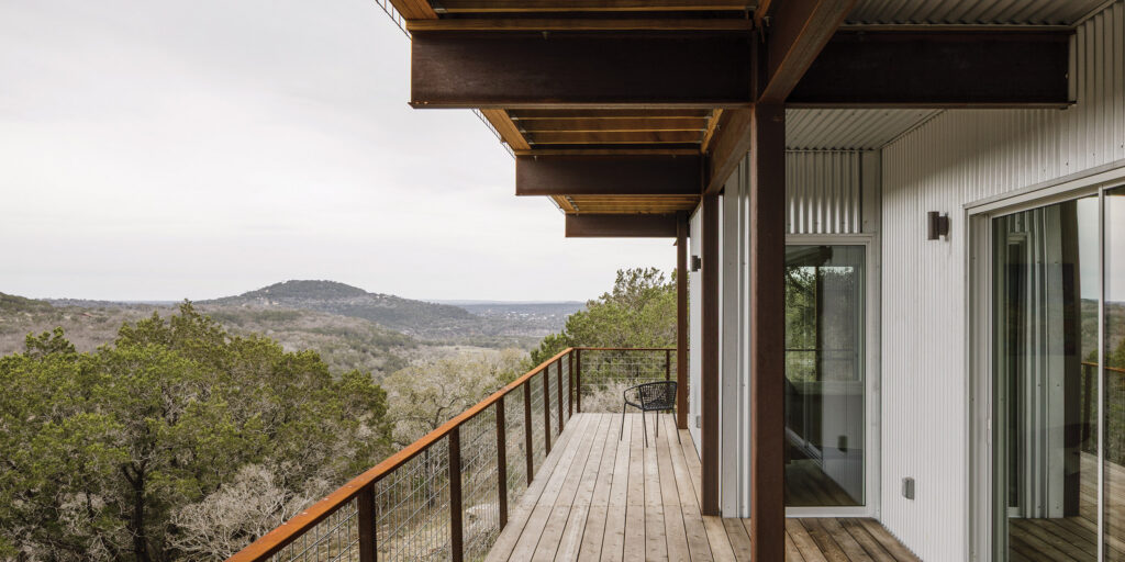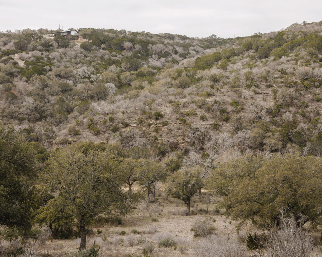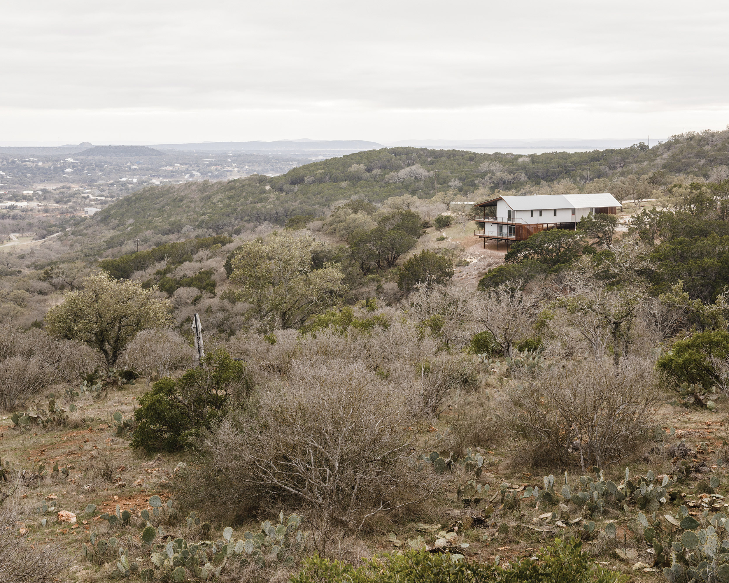 High up, a house by Low Design Office (LowDO) perches atop a rocky outcrop overlooking what is ostensibly a wolf-inhabited creek. One of LowDO’s recent residential design-build projects, the house was completed in spring 2024 and sits near Lake Buchanan, close to Burnet, about 60 miles northwest of Austin. Getting there requires a drive that is both windy and winding. Cliff faces, studded with cacti, line the roads that climb the hills overlooking the lake and surrounding valleys. The neighborhood is made up of large, sloped lots—some complete with helipads, or so I am told. The home’s site, approximately 22 acres, occupies the crest of a hill that just barely peeks over Lake Buchanan. The house itself, however, does not sit squarely on top of the hill; instead, it juts outward from it, floating into the valley beyond.