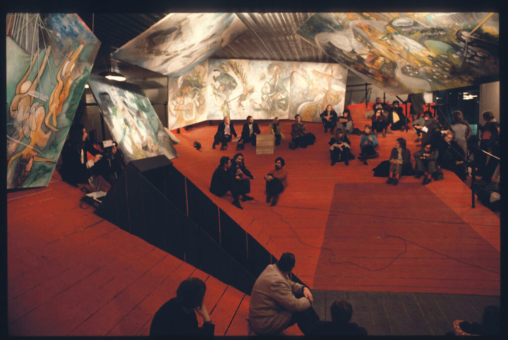 Siddiqui’s comparison of the plans of the practicables shows the differences between them, most designed to fit in existing interiors, with an exception in the entirely outdoor practicable in Douai. Parent also formally solicited feedback through workshops, but ambulation on a sloped surface was the principal way the tour fostered subjective experiences. In the exhibition text for the tour’s first stop at the Nouveau Musée du Havre, Parent identified movement as the fourth dimension of architecture, beyond the three orthogonal axes of space. Parent’s practicables hosted mime shows, paintings, gymnastic routines, and screenings, each attempting to blur the line between life and art (or architecture). Rather than treating this programming as ancillary, Siddiqui convincingly frames it as integral to Parent’s experiments.