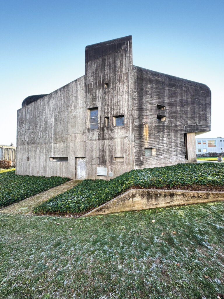 The roots of “la fonction oblique” trace back to Parent’s partnership with theorist and urban planner Paul Virilio. Together they formed Architecture Principe, a think tank and architecture office, in 1963. Virilio’s research into German World War II bunkers along the French coast influenced the firm’s most significant built work, the Church of St. Bernadette in Nevers, whose concrete exterior evoked bunkers. Its interior rejected orthogonality, replacing level floors with sloped slabs. Siddiqui includes photos from Parent’s other built work, such as a strip mall in Sens which stands out as a reminder that commercial typologies can also be sites of spatial experimentation.