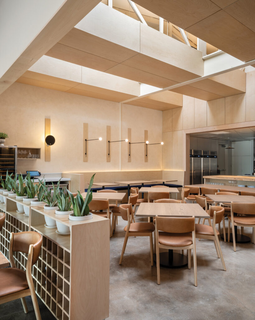 With limited square footage available, the floor plan neatly organizes spaces within the existing shell. Primary walls define consecutive spaces for cooking, dining, lounging, and a covered patio. Along the western edge of the building, a secondary wall conceals pockets of space for dish washing, storage, restrooms, and the back bar, keeping them out of sight. While each of the primary spaces feel distinct, generous openings in the interior walls and floor-to-ceiling glass at the patio provide connections that extend from the open kitchen all the way to the street.