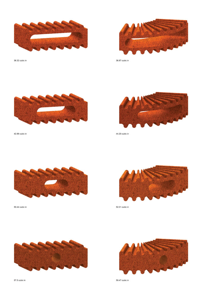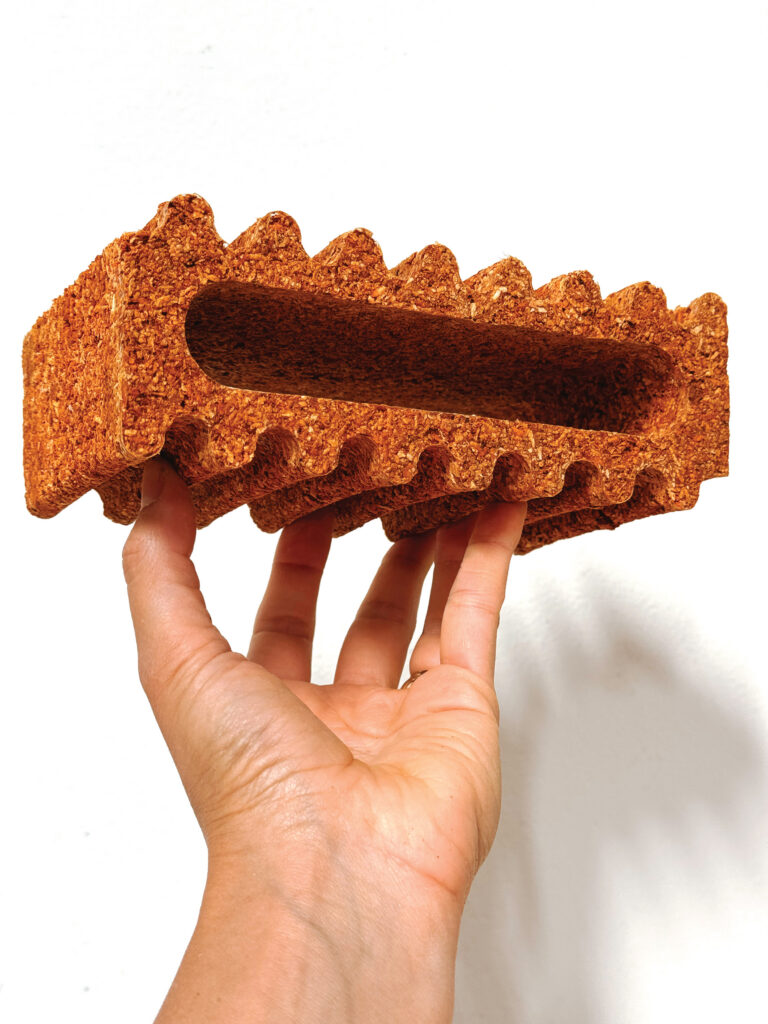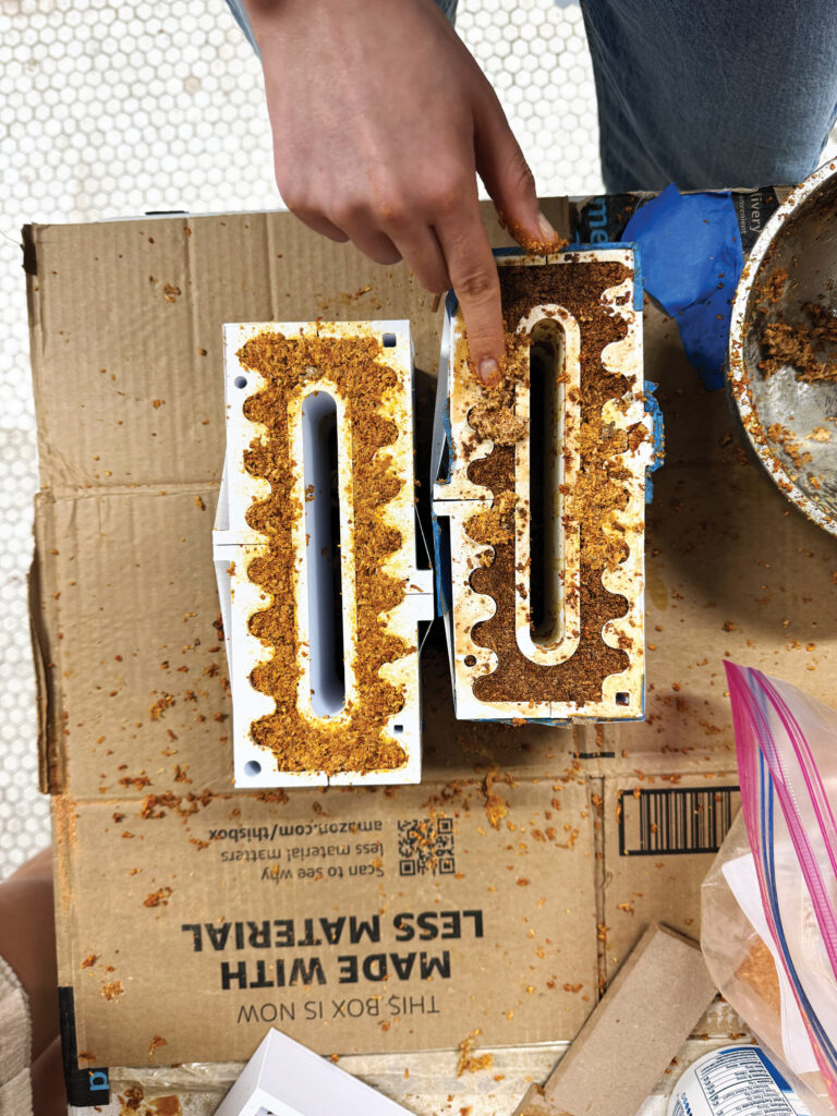 The avocado bricks were designed as linear and curved elements that could be arranged into a variety of wall configurations. Ridges at the top and bottom of each brick were calculated to allow modular stacking without the use of mortar. The bricks also incorporate apertures of varying sizes, ranging from smaller perforations to larger central openings. The molds used to cast the avocado particles were 3D printed in in various segments with polylactic acid (PLA) material to allow for easy removal.