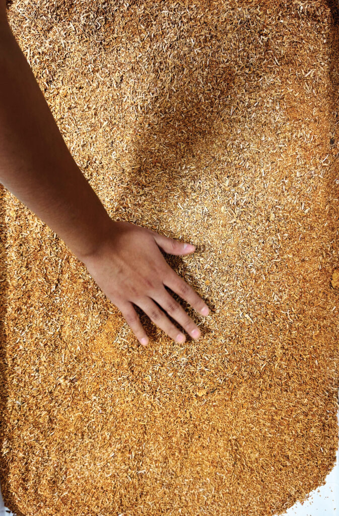 What, then, is possible with this abundance of avocado waste? Over the past year and a half, I have dissected, analyzed, and fabricated with avocado seeds. The process of transforming these seeds was both intuitive and experimental. After carefully cleaning each seed, I began examining the material’s friability through various forms of manipulation. Carbohydrates make up approximately 65 percent of an avocado seed’s mass, giving it a molecular makeup similar to that of a potato. Anyone who has grated a peeled potato knows the effortlessness of that action. Using a low-tech, manual kitchen box grater, I processed each seed. The material was then sun-dried, becoming lightweight, starchy particles that could be compacted and shaped within molds when mixed with an adhesive.
