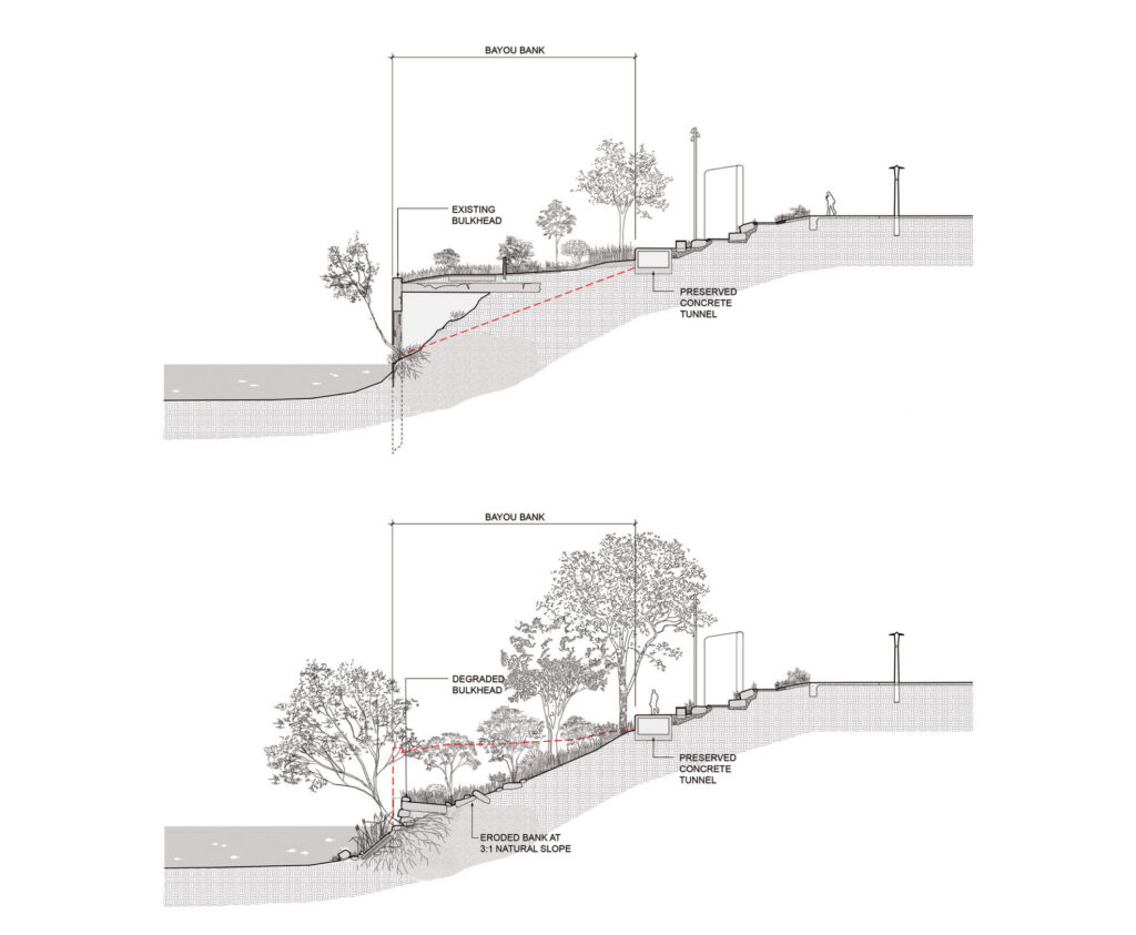 As a result of urban development upstream along the bayou, both the volume and flow of water moving through the channel have increased. With each storm, the banks shift and scour, flushing sediment downstream to Galveston Bay and leaving behind steep slopes that are gradually eroded and flattened by gravity. Through this ongoing cycle, the bayou continually carves a new form, transforming itself into a wider river with gentle banks where plants can take root.